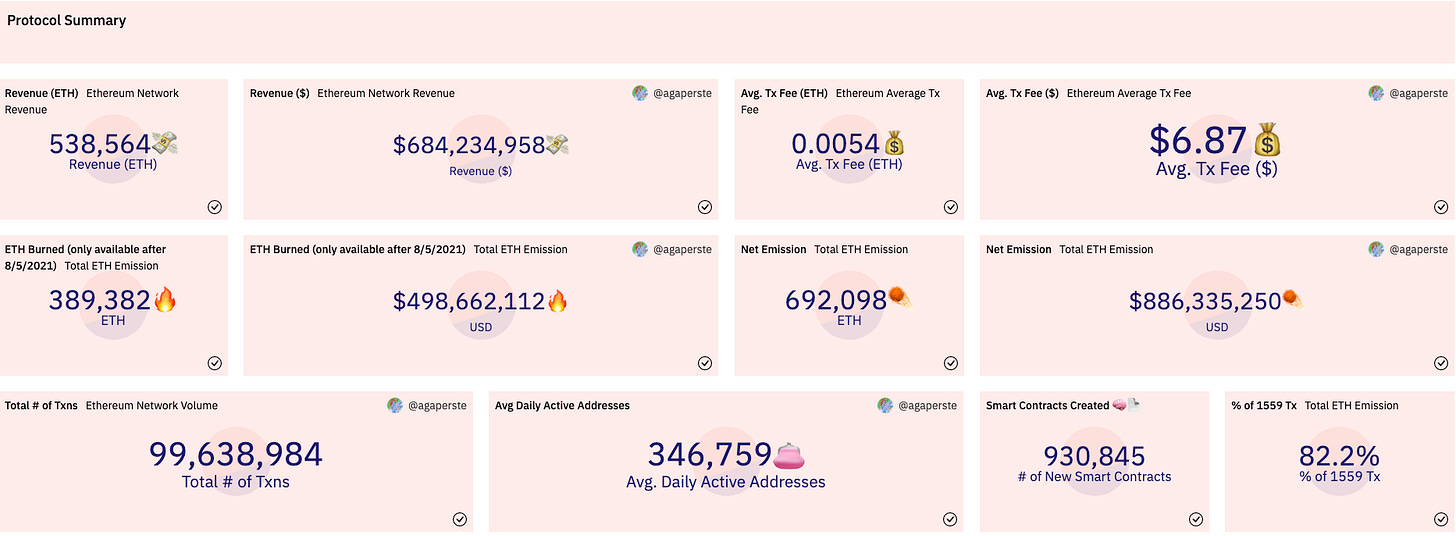 This dashboard attempts to show the state of the Ethereum network for a chosen quarter. It looks at the network protocol as whole in terms of price, transactions, fees, and users. It also looks at the Ethereum ecosystem through metrics such as top projects by transaction fees and transaction volumes