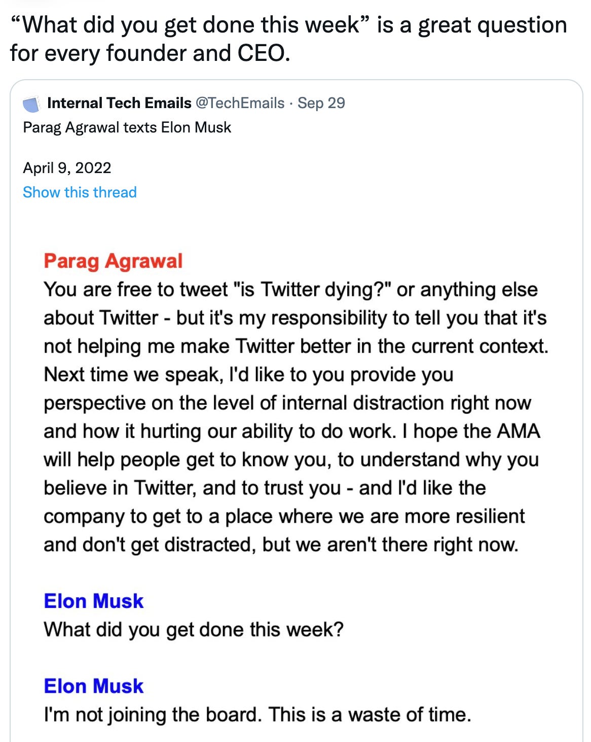 For those who don’t know, these are the actual text message exchanges between Parag Agarwal (Ex-CEO of Twitter) and Elon Musk before the acquisition. Great guys don’t necessarily mean they are great at the problem at hand. Focus. Always Focus. Period.