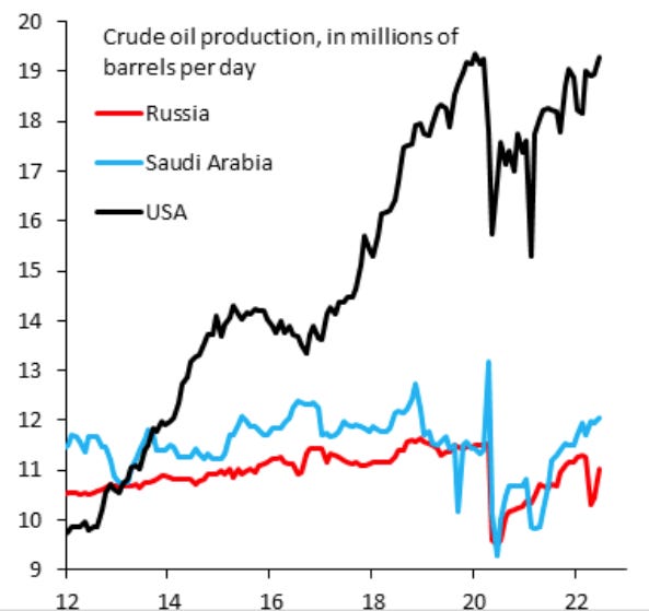 US oil production literally swamps everyone else. Food for thought: SPR Reserves apparently have reached lower than the 90’s. We don’t know how accurate the chart is but do believe there are some macro changes in the crude oil markets and OPEC, OPEC+ relationships that will influence the macro-economic conditions.